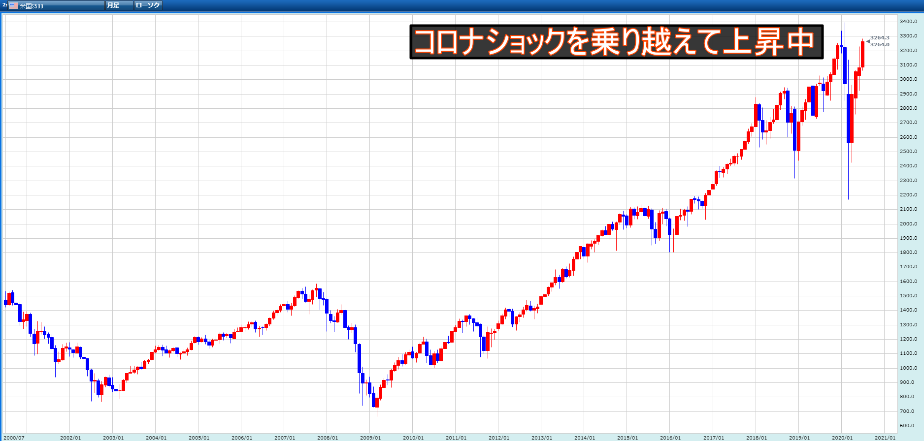 米国S500の長期期間のチャートを見るとコロナショックで一時的に暴落しましたが、既に元の水準まで回復しています。