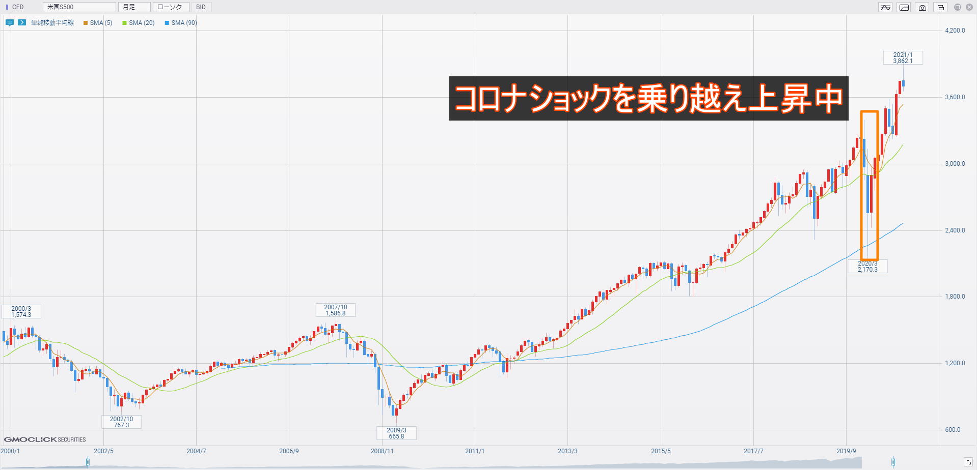 米国S500の長期期間のチャートを見るとコロナショックで一時的に暴落しましたが、すぐに元の水準回復、あっという間に乗り越えて上昇していきました。