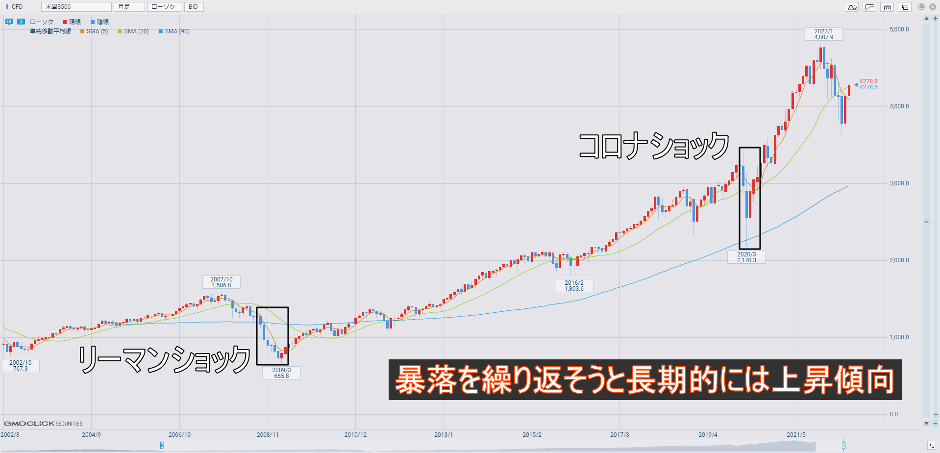 まあ、このまま回復するのか、もう一回下落するのかは分かりませんが、チャートを見れば下落を繰り返しながらも長期的には上昇傾向であることが分かります。