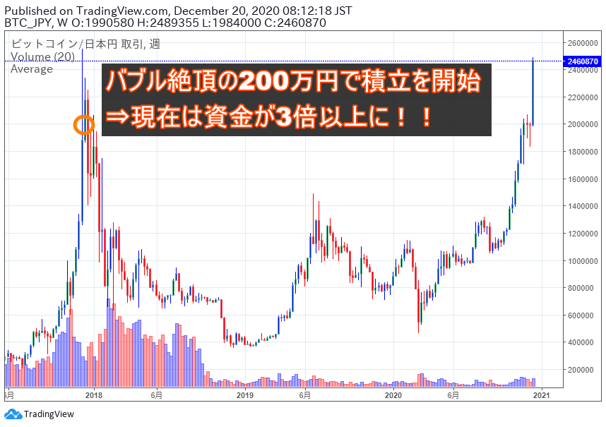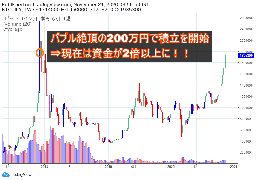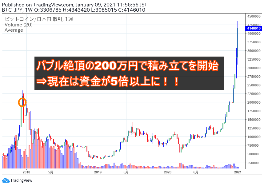 2017年12月のバブル絶頂期に積み立てを始めても時価総額が伸びているということは、この手法はビットコインが上昇傾向である限り、仮にこのあと大暴落するとしても有効な手法だということがわかります(#^.^#)