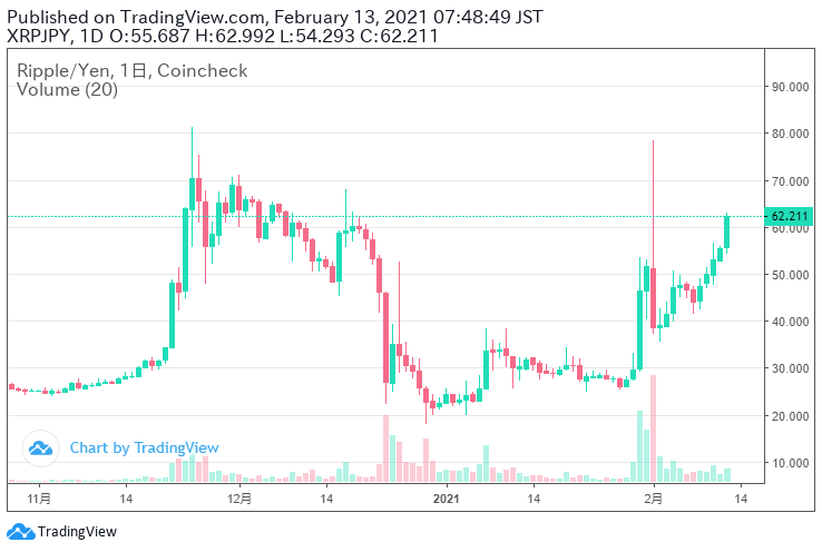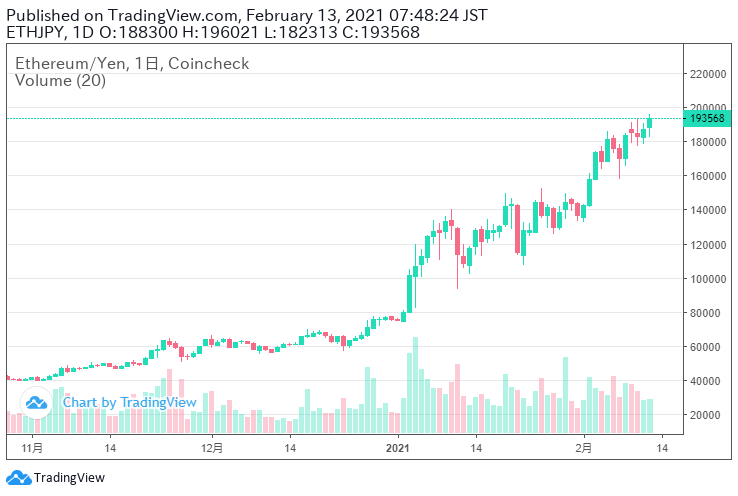 ビットコインのチャートを見ると、一旦上昇が落ち着いたように見えますが、テスラのビットコイン保有のニュースなどで、再度上昇して最高値を更新!!
