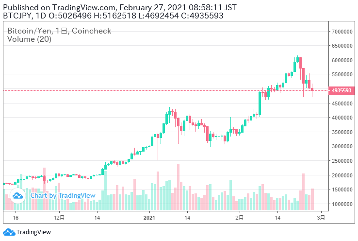 ビットコインのチャートを見ると一旦上昇は落ち着いたように感じられ、Twitterでも「さらに大きな調整が来る」という意見もちらほら出て来ています。