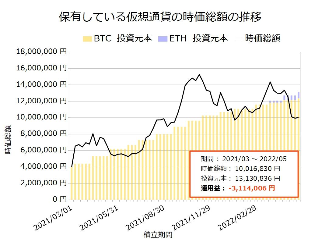 下の図は毎月積み立てている仮想通貨の積立原資と時価残高の推移を表しています。