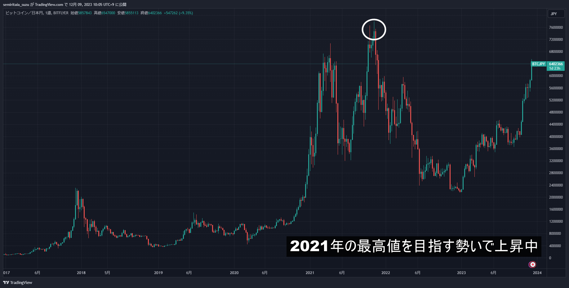 2020年⇒2021年に上昇した時と似た勢いな上に上昇の起点が2020年の時より高値なので、どこまで上昇できるか楽しみにしています(#^.^#)