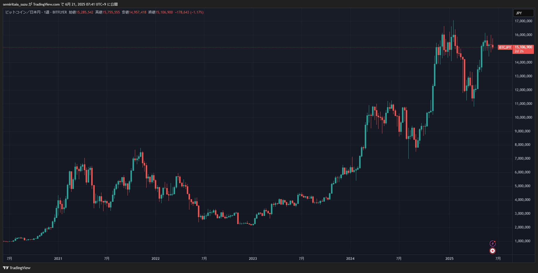 もちろんこのあとビットコインが下落するなら一旦売って買い戻すのが正しいですし、このまま上昇するなら全力買いが正しいです。