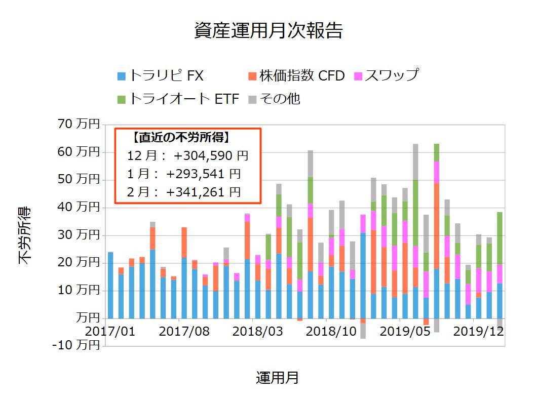 ブログ収入と一緒に表示すると少なく見えますが、2月は資産運用だけでも約30万円の利益とそれだけでも問題なく生活できる金額です。