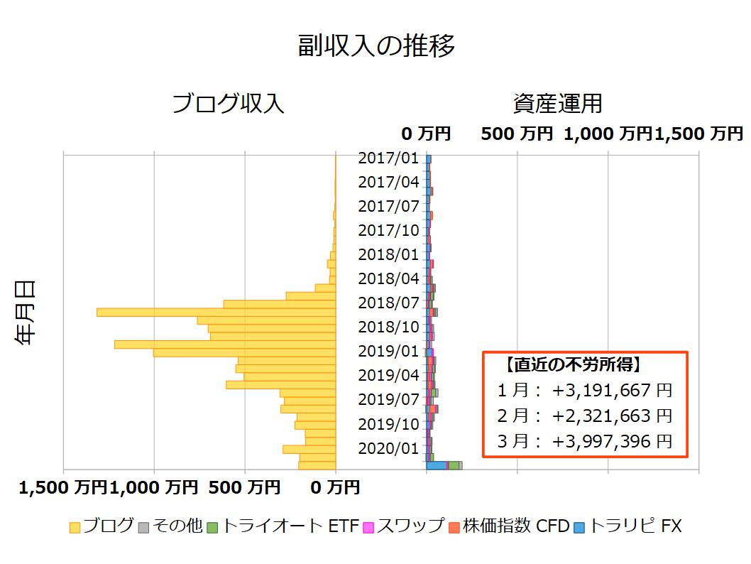 資産運用と副業で始めたブログ収入について、2020年3月の内訳を報告していきます。