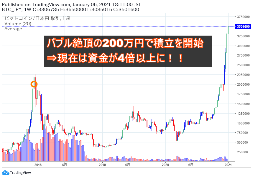 2017年12月の仮想通貨バブルの絶頂期より、毎月1万円ずつ4銘柄を積み立てています。