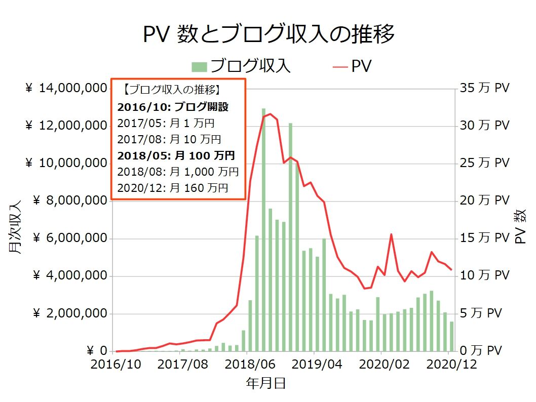 ブログ収入は波が激しすぎて、もうよくわからない水準になっていますが、12月は約160万円の収入になっています。