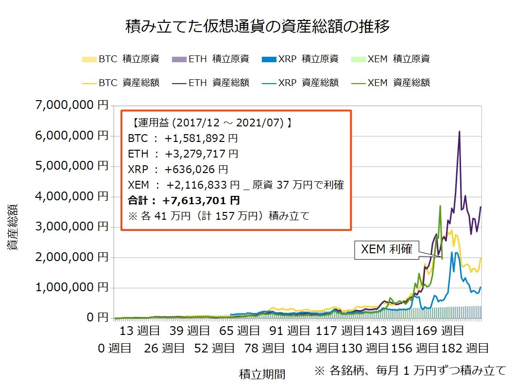 2017年12月の仮想通貨バブルの絶頂期より、毎月1万円ずつ4銘柄を積み立てています。