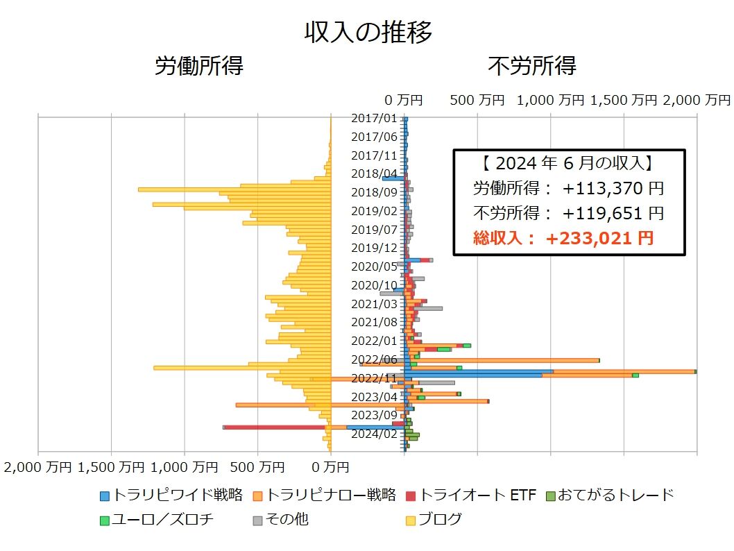 セミリタイア生活中の不労所得と労働収入について、2024年6月の内訳を報告していきます。