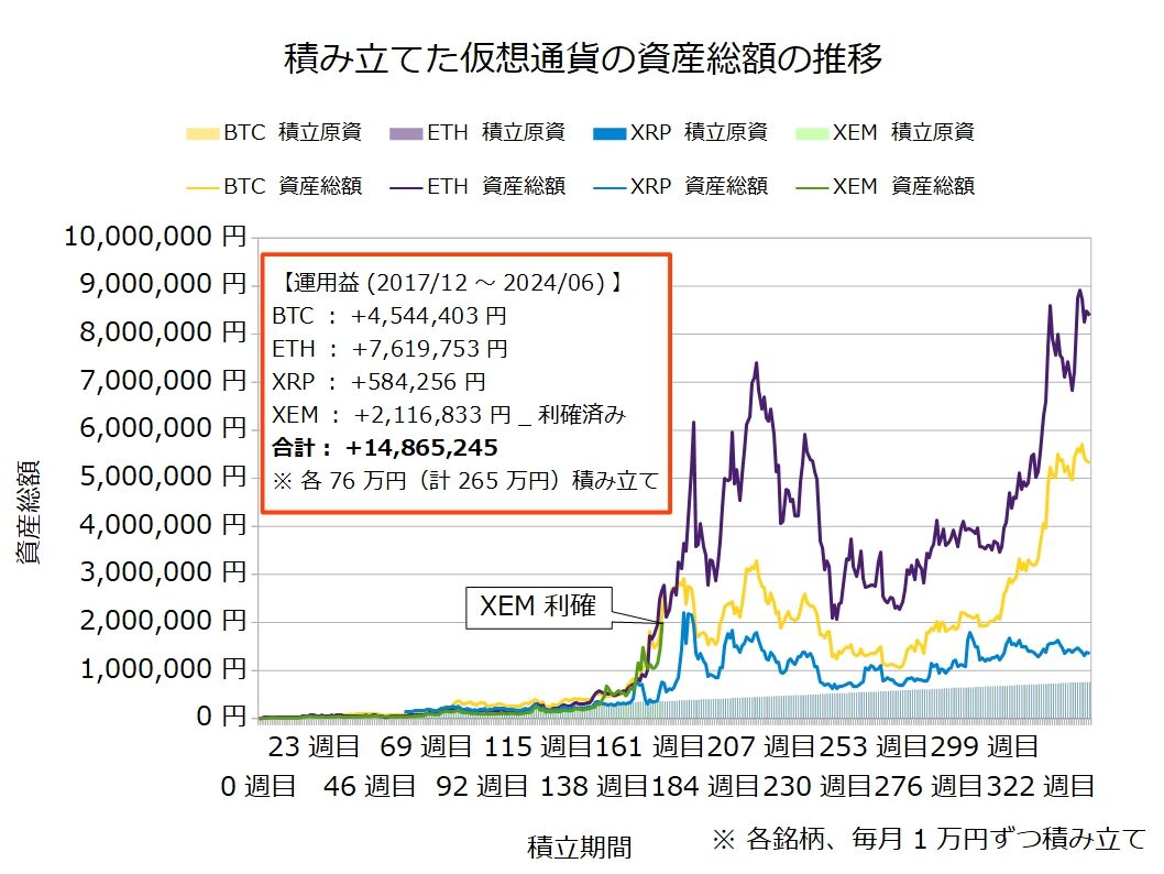 2017年12月の仮想通貨バブルの絶頂期より、毎月1万円ずつ4銘柄を積み立てています。