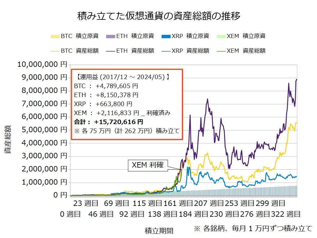 2017年12月の仮想通貨バブルの絶頂期より毎月1万円ずつ4銘柄を積み立てています。