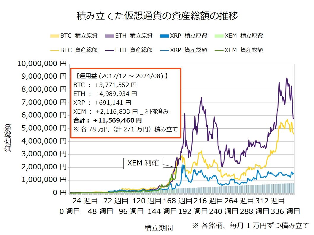 2017年12月の仮想通貨バブルの絶頂期より、毎月1万円ずつ4銘柄を積み立てています。