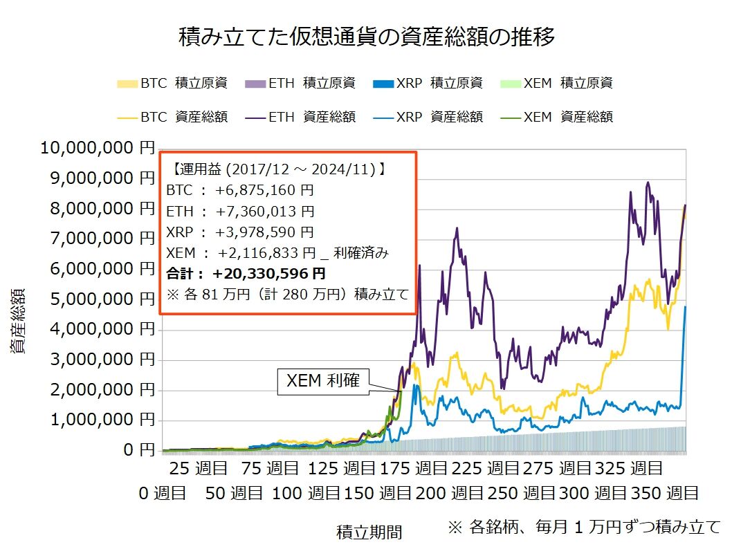 2017年12月の仮想通貨バブルの絶頂期より、毎月1万円ずつ4銘柄を積み立てています。