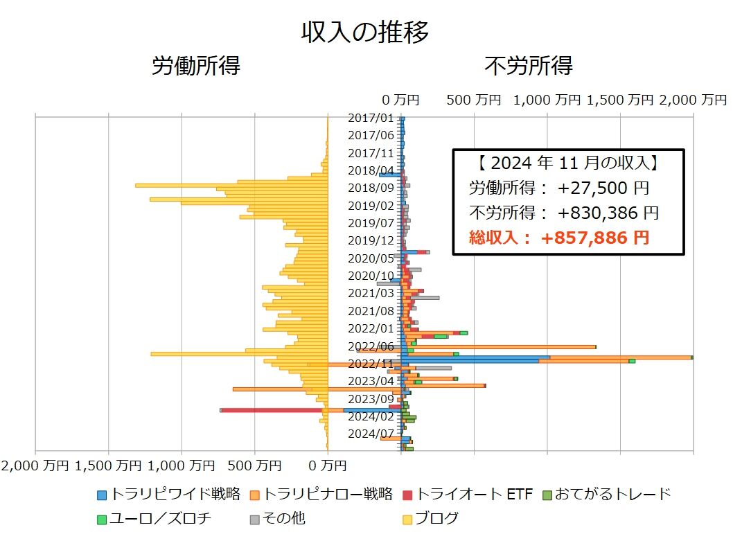 セミリタイア生活中の不労所得と労働収入について、2024年11月の内訳を報告していきます。