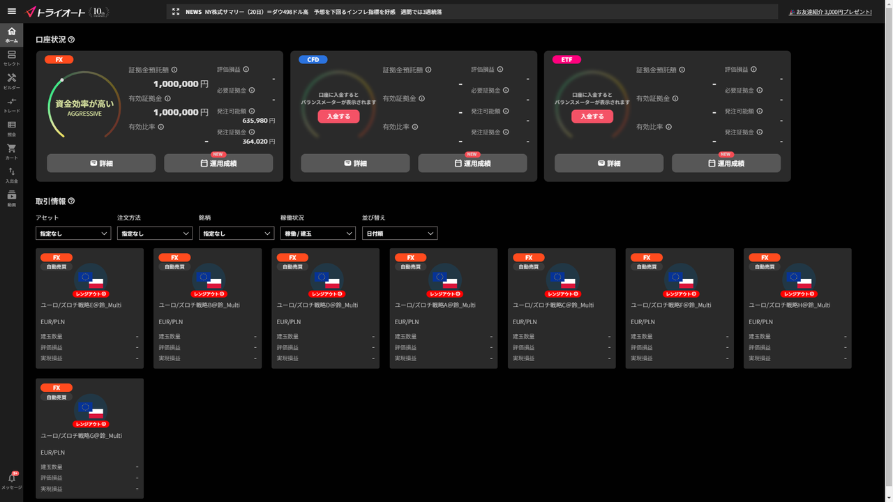 現在、約1億円で『広いレンジに仕掛ける初心者向けのワイドレンジ戦略』と『狭いレンジに仕掛ける中級者向けのナローレンジ戦略』の2階建てで運用しています。