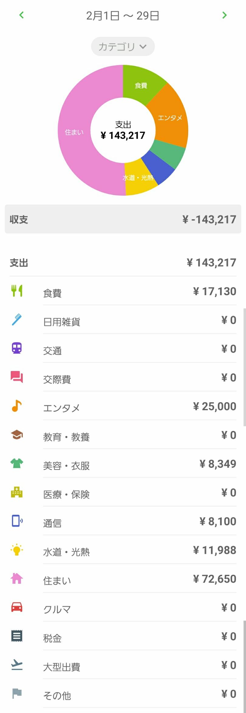 ▼こちらが2020年2月の生活費になります