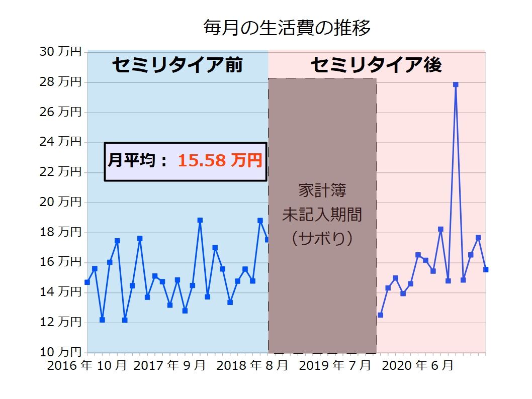 まだ考察できるほどセミリタイア後の実績があるわけではありませんが、それでもセミリタイアして2年経った感触だと、生活費はそれほど変わらない印象です。