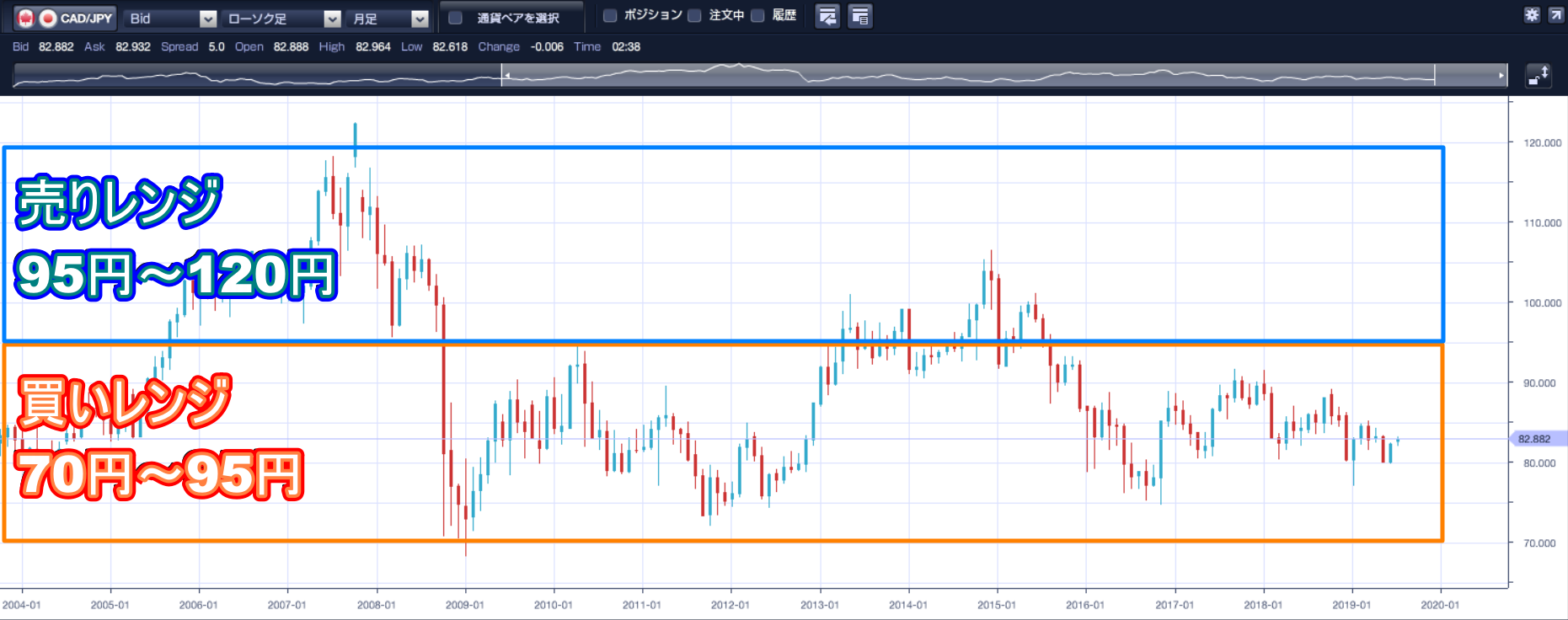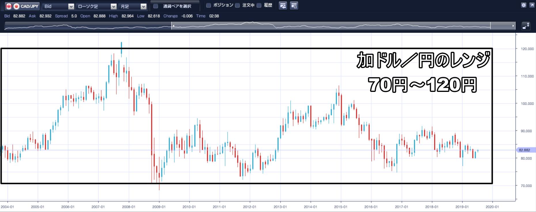 チャートを見るとおおよそ70円~120円の間で推移していますので、加ドル/円は70円~120円のレンジ相場だと仮定して買って、売ってのループイフダンを仕掛けていきます。