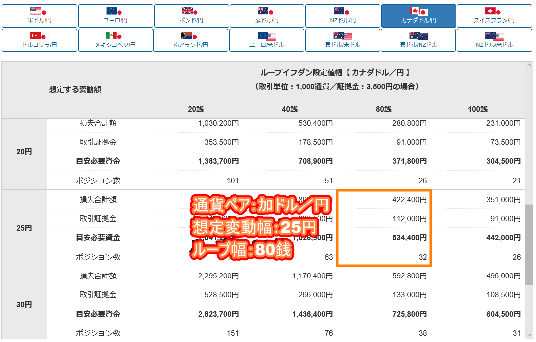 加ドル/円のループイフダン設定を以下の表にまとめました。