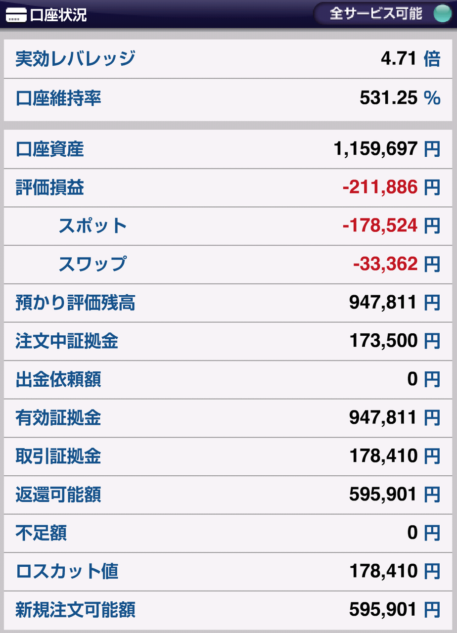 - 預り評価残高:969,143円 ⇒ポジションを全て決済した場合に残る資金