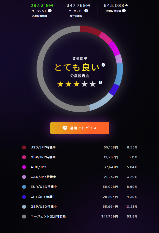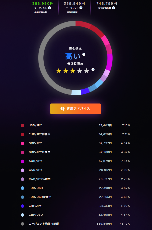 危険水準にならないのが理想ですが、もし損切りが繰り返され、危険水準になった場合は数量や稼働するエージェントを減らすことで、ロスカットさせずに運用を続けます。