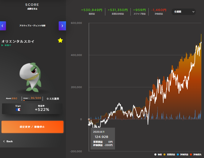 損益曲線を確認し、チャートの上昇下落に関係なく利益を積み重ねてるのが万能型のエージェント。