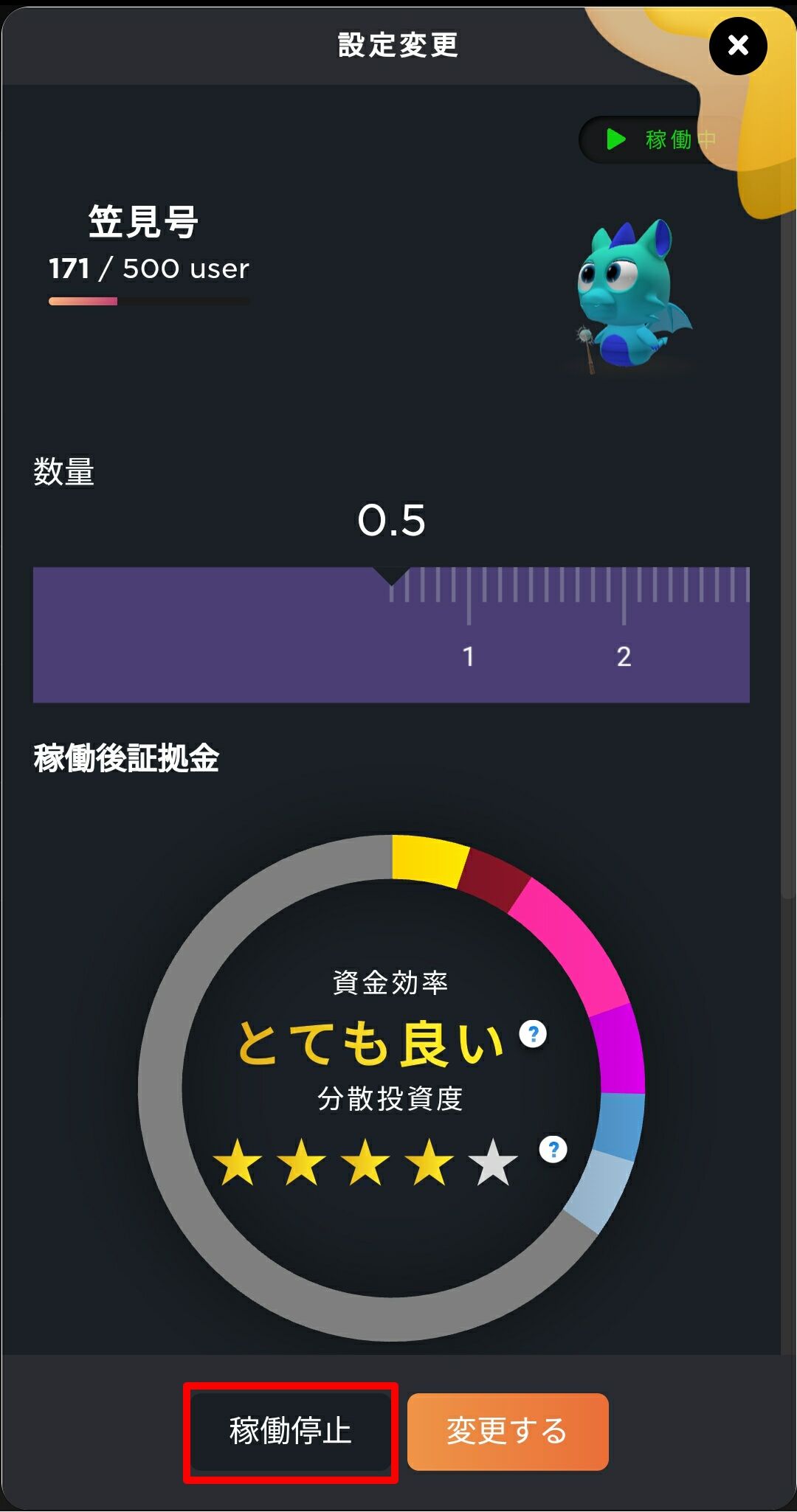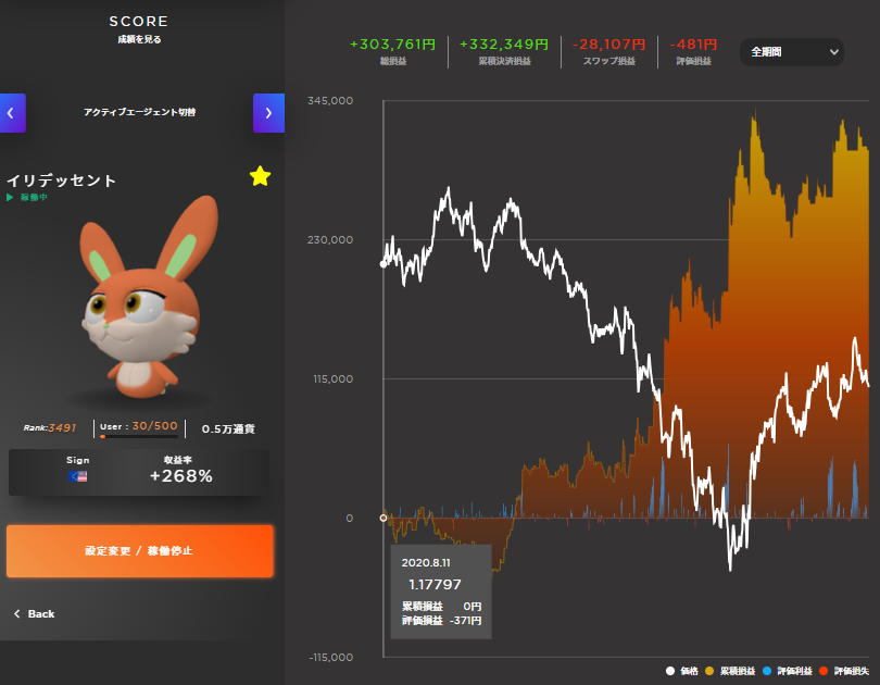 逆に『資金効率:危険水準』の場合はロスカットの危険が高いので、稼働するエージェント数や数量を減らした方が無難でしょう。
