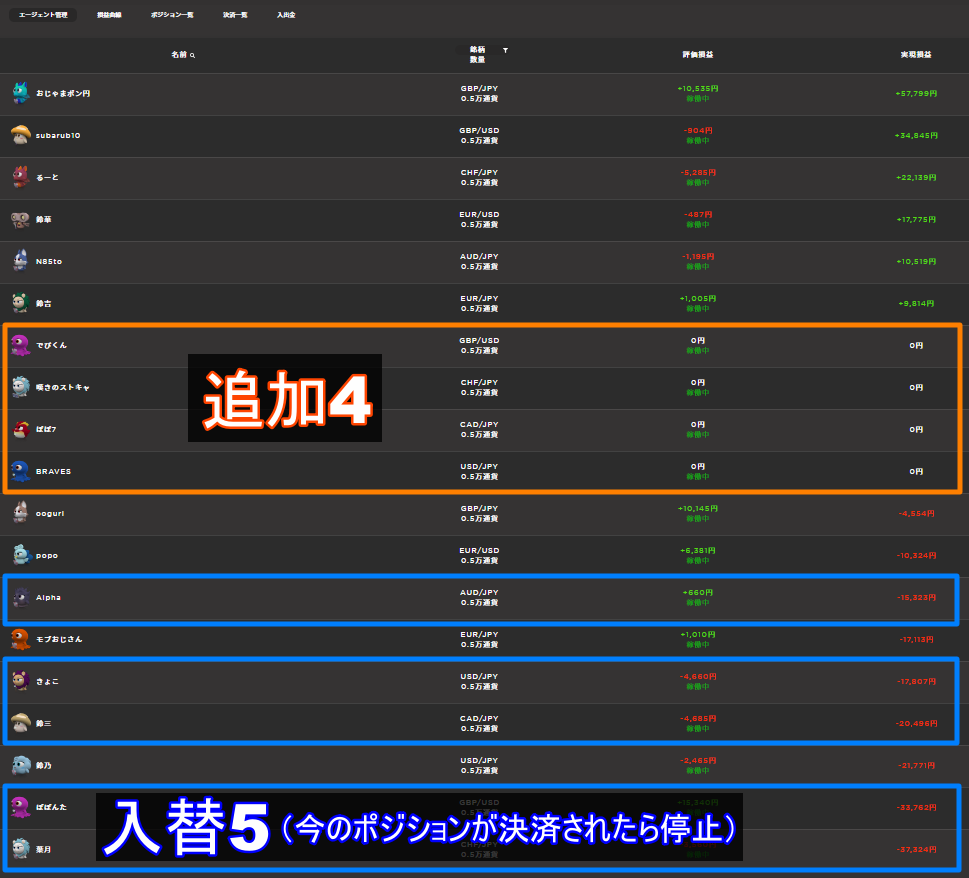 実際の運用なら追加対象の4エージェントはすぐには稼働させず、入替対象の5エージェントのポジションが無くなってから稼働させればよいと思います。