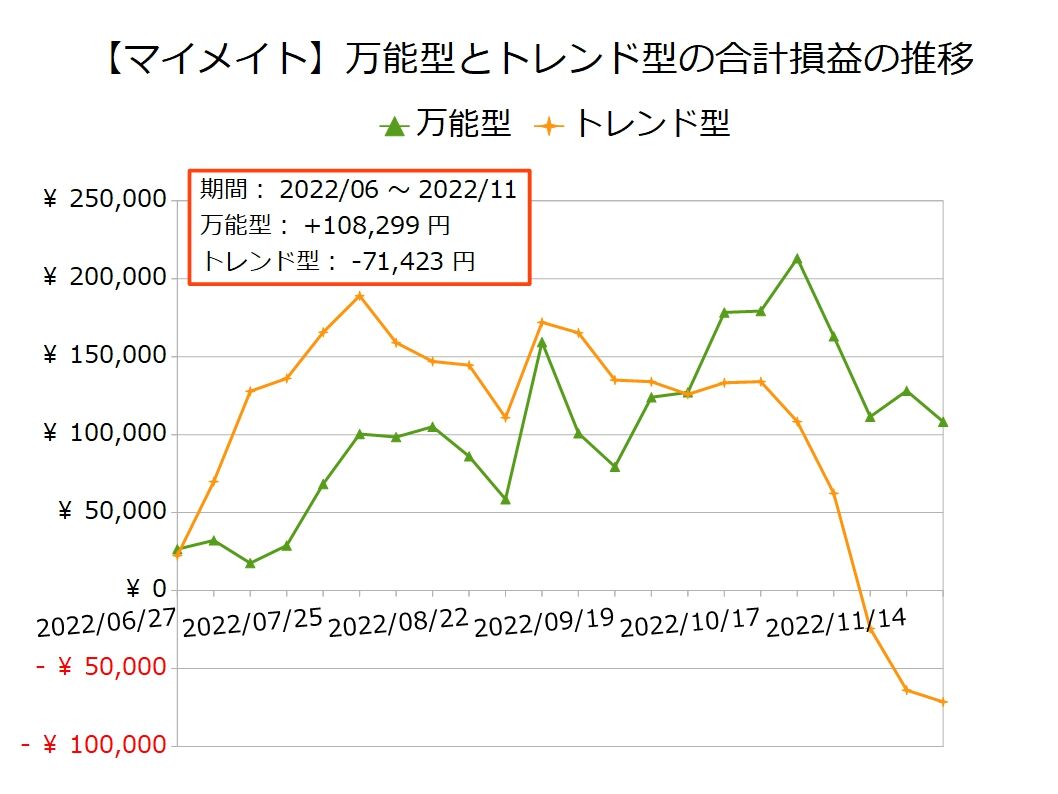万能型はまだ右肩上がりと言える形状ですが、トレンド型はマイナス圏を突き進んでいます。