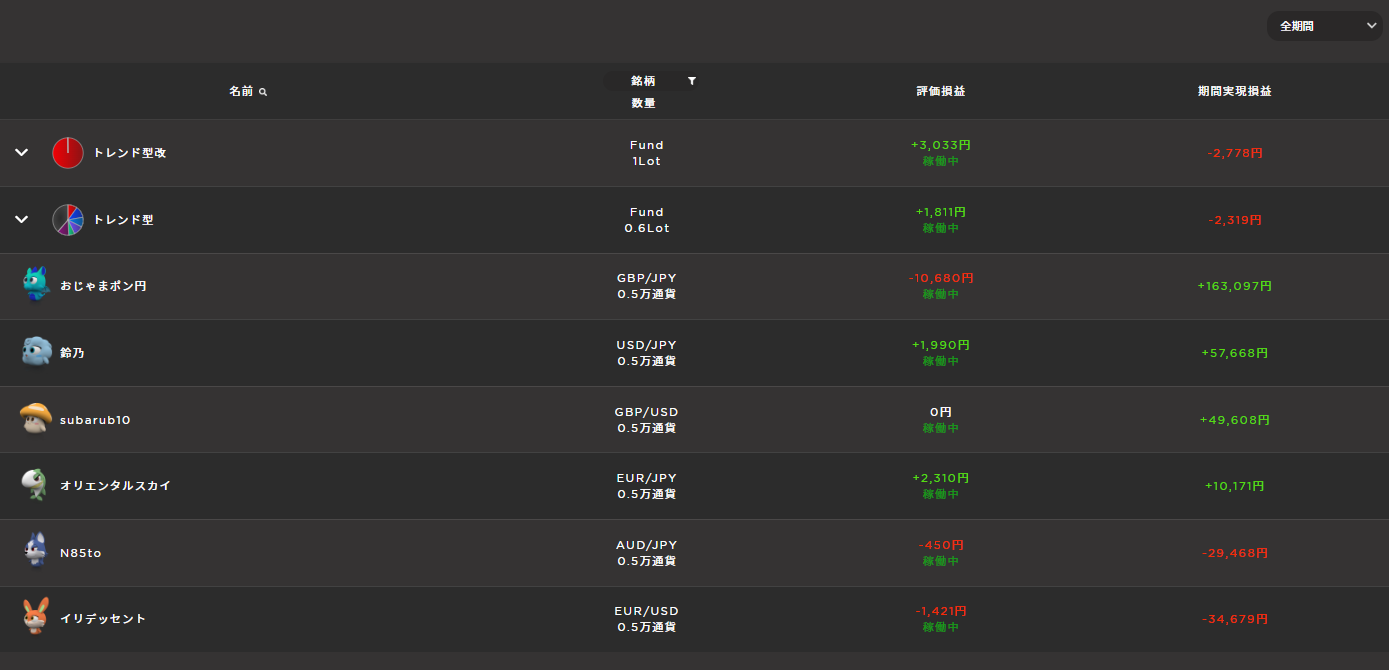 | 種類 | 名称 | 今週の利益 | 累計利益 | 評価損益 | 数量 |