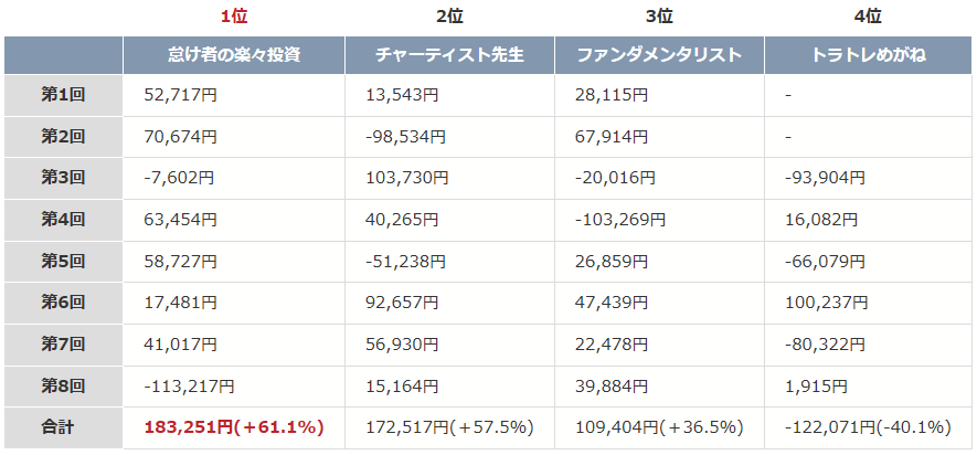 トラッキングトレードではガチンコバトルと言って、トラッキングトレードの熟練トレーダーが期間3カ月、元手30万円で利益を競うイベントが定常的に開催されています。