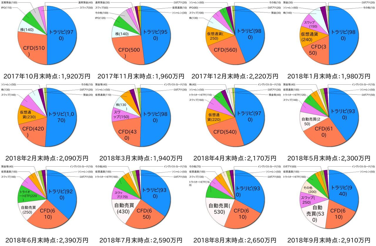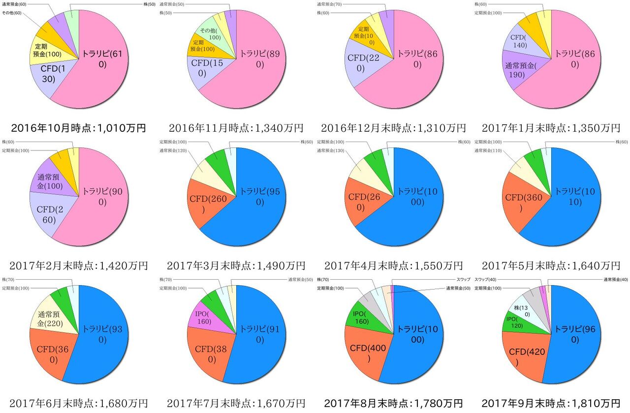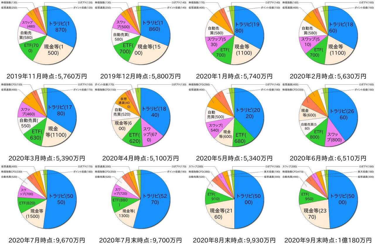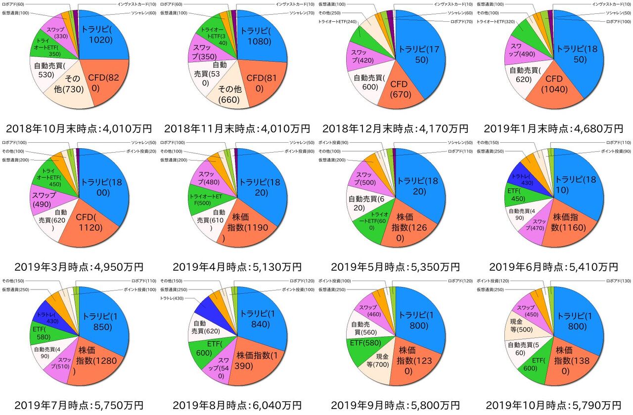 ポートフォリオを並べてみると徐々に様々な商品へ分散されて行きますが、序盤はトラリピで資産形成をしてきたことが分かります。