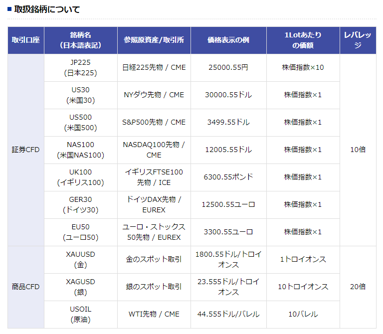 | 最大レバレッジ | 株価指数CFD:10倍 商品CFD:20倍 |