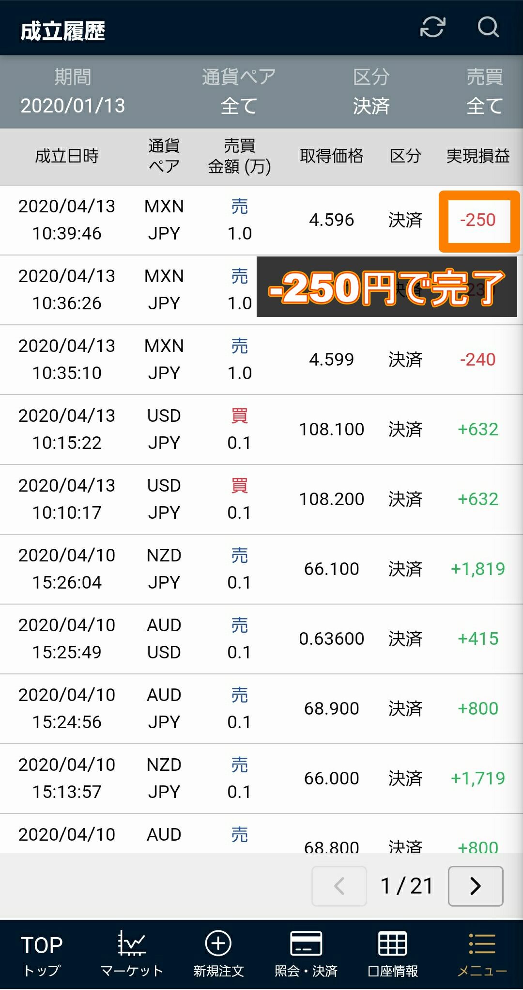 わたしが試しにやってみたところ、250円の損失で1万通貨を取引し、書籍&限定レポート受け取り条件を満たしました!!