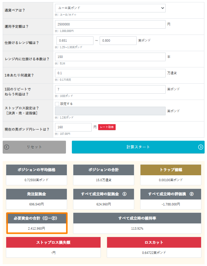 実際にユーロ/英ポンドの設定をトラリピ運用試算表に入力してみると、下落した場合は250万円万円、上昇した場合は270万円必要になると試算が出ます。