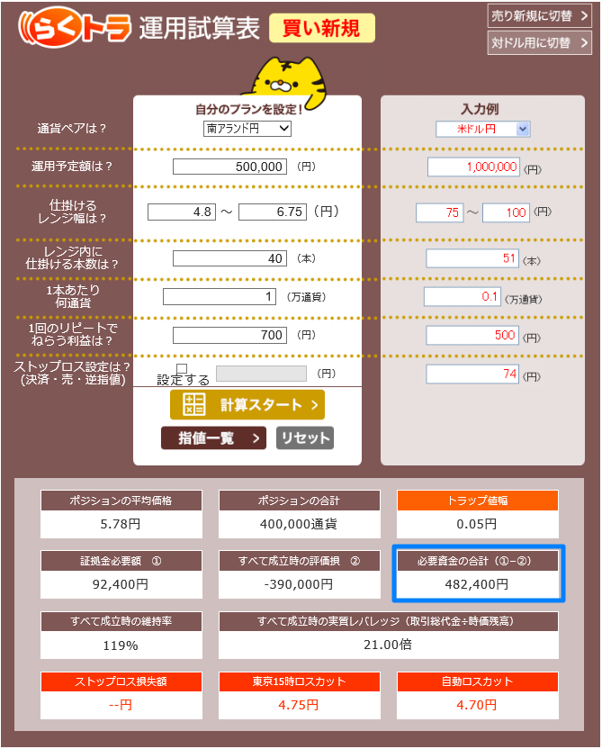 実際にメキシコペソ/円の設定をらくトラ運用試算表に入力してみると下落した場合は50万円必要になると試算が出ます。