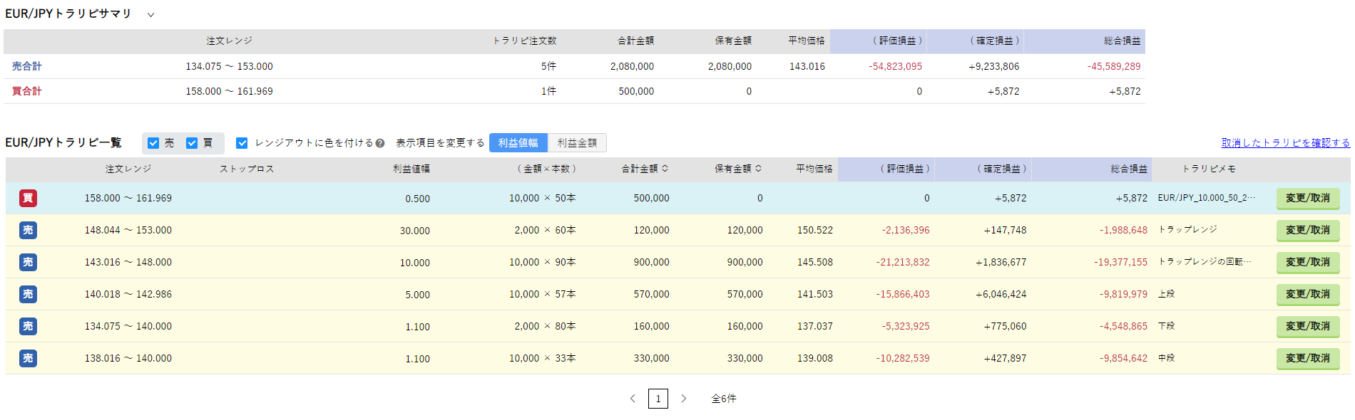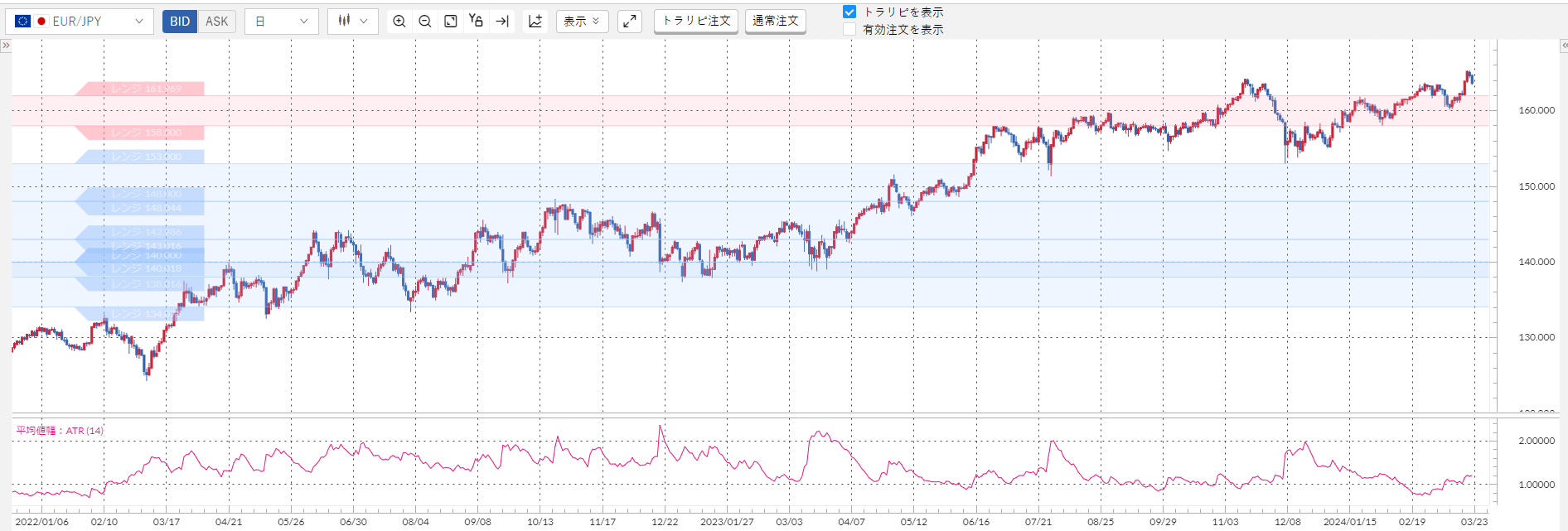 そこで、160円前後の水準で推移している間に少しでも損失を減らすために、2月から売りポジションの約4分の1の数量(50万通貨)でユーロ/円の買いトラリピを仕掛けています。