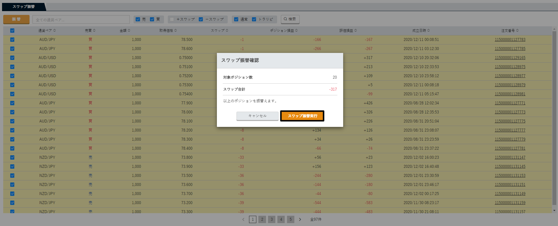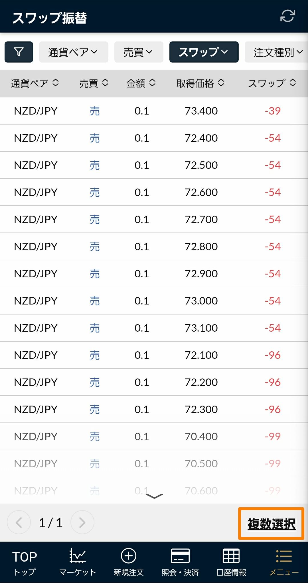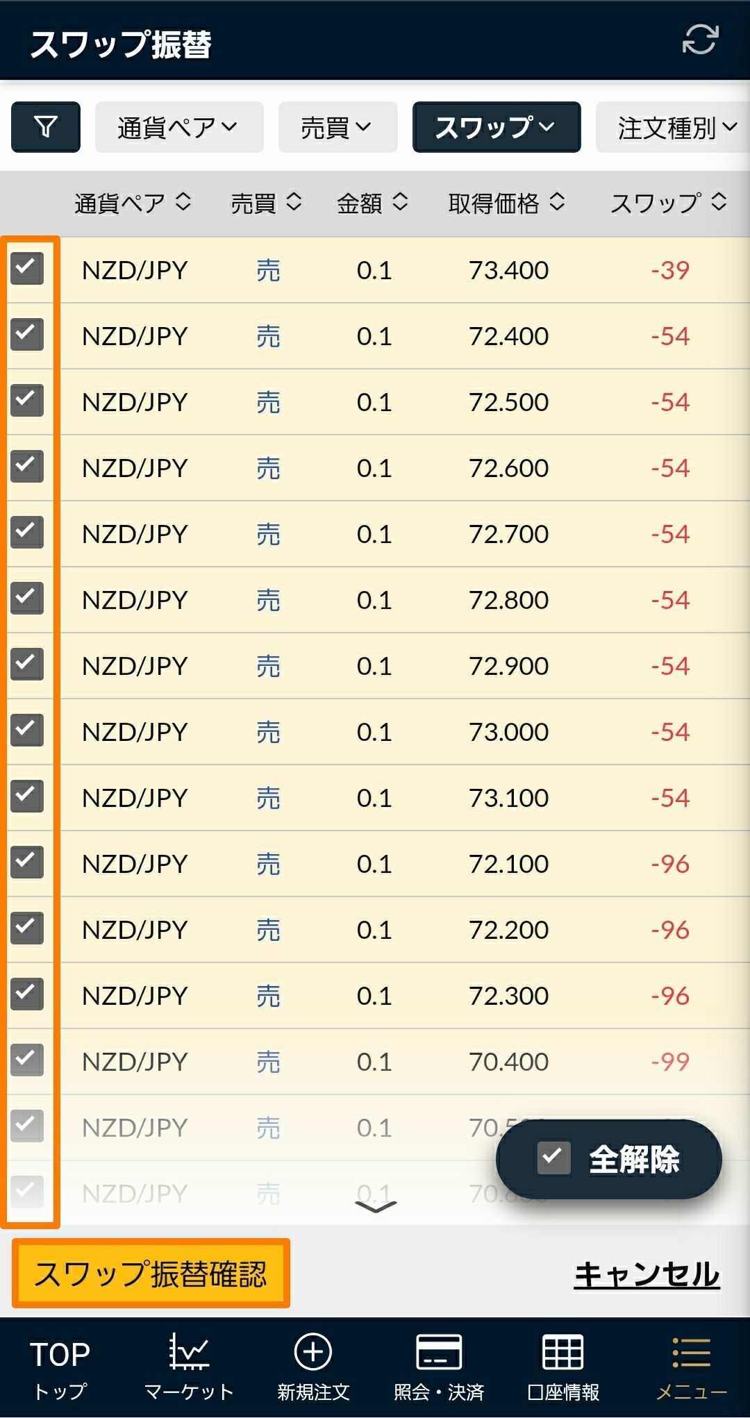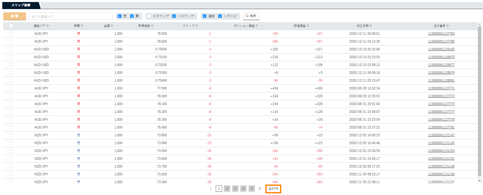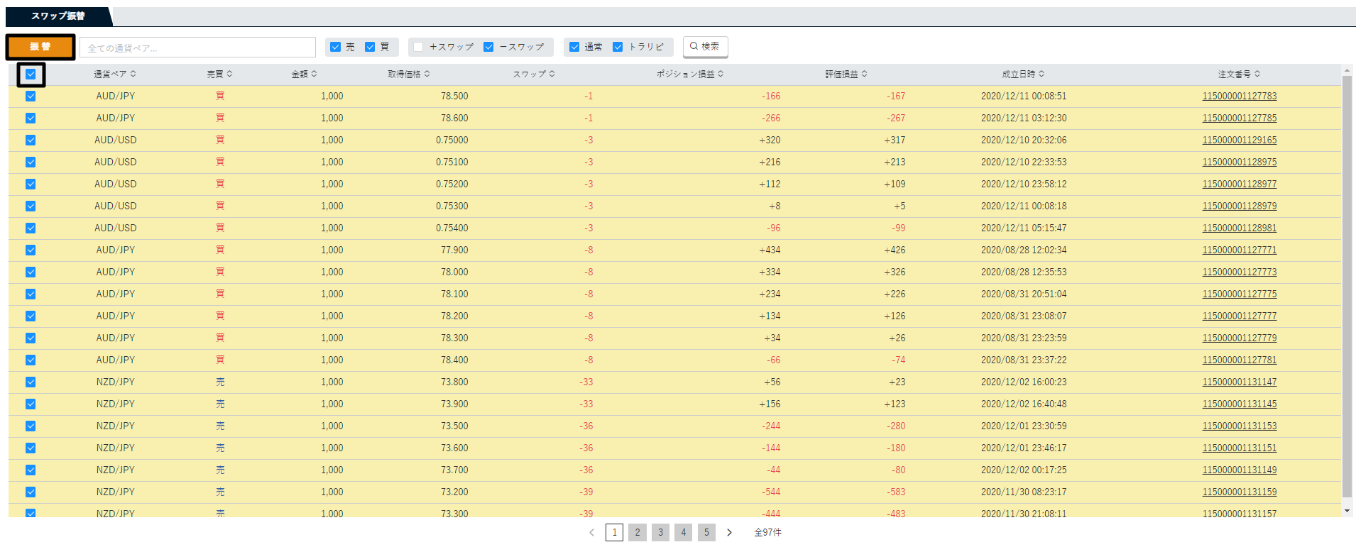 『-スワップ』で抽出すると97件のポジションでマイナススワップが蓄積されていることが分かります。