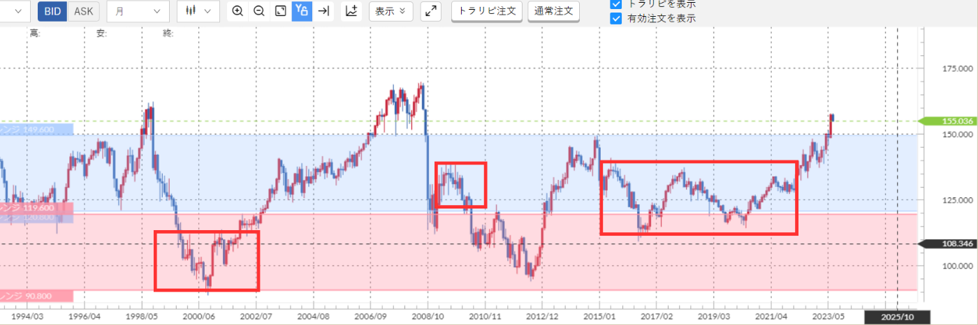 逆に150円⇒149円⇒148円⇒147円⇒……⇒140円⇒139円⇒…… と一方的に動くと150円のトラップ