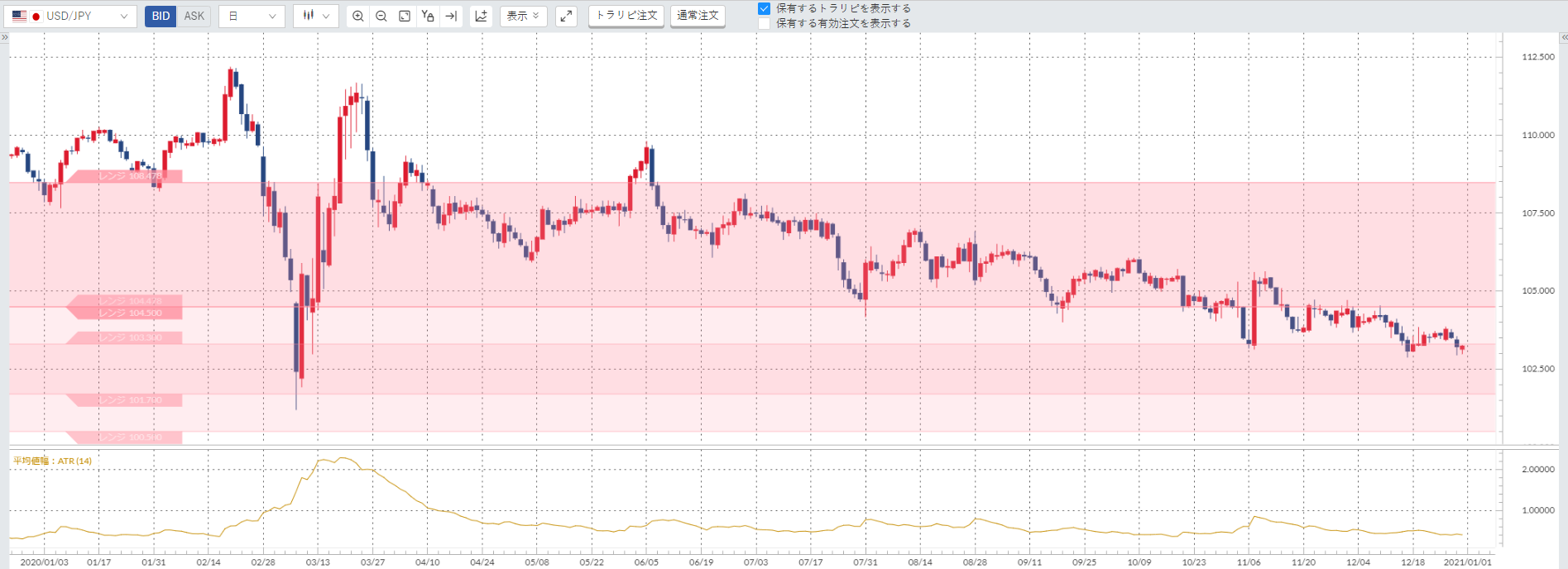 チャート下に表示(黄色い線)しているATR(1日の平均的な値動き)を見てもコロナショック以降は動きの幅が小さくなり、超低空飛行していることが、はっきりと分かります。