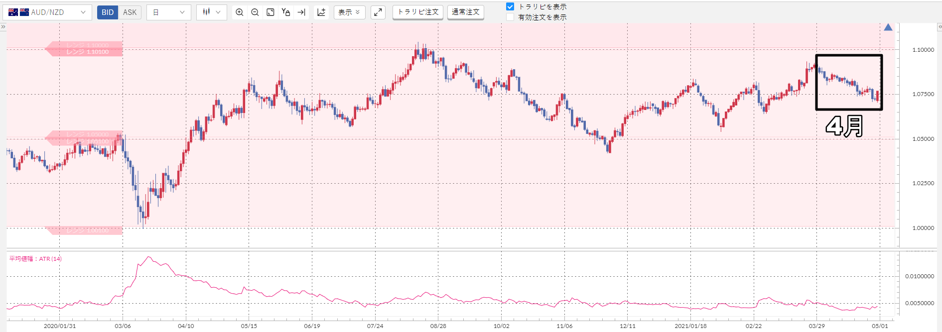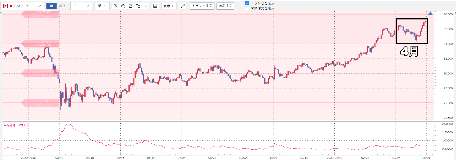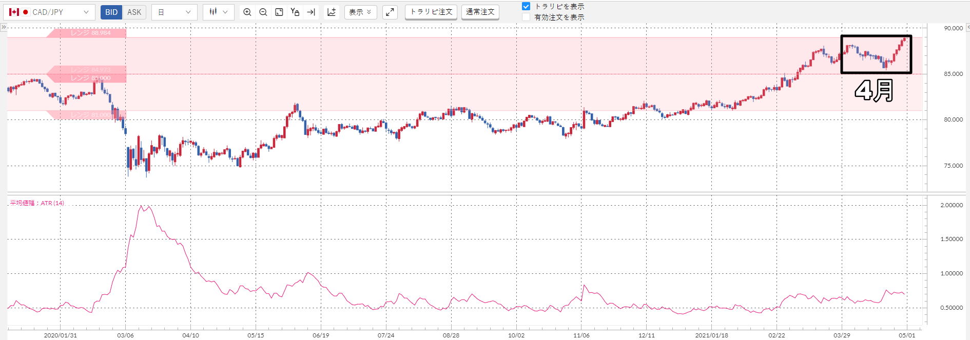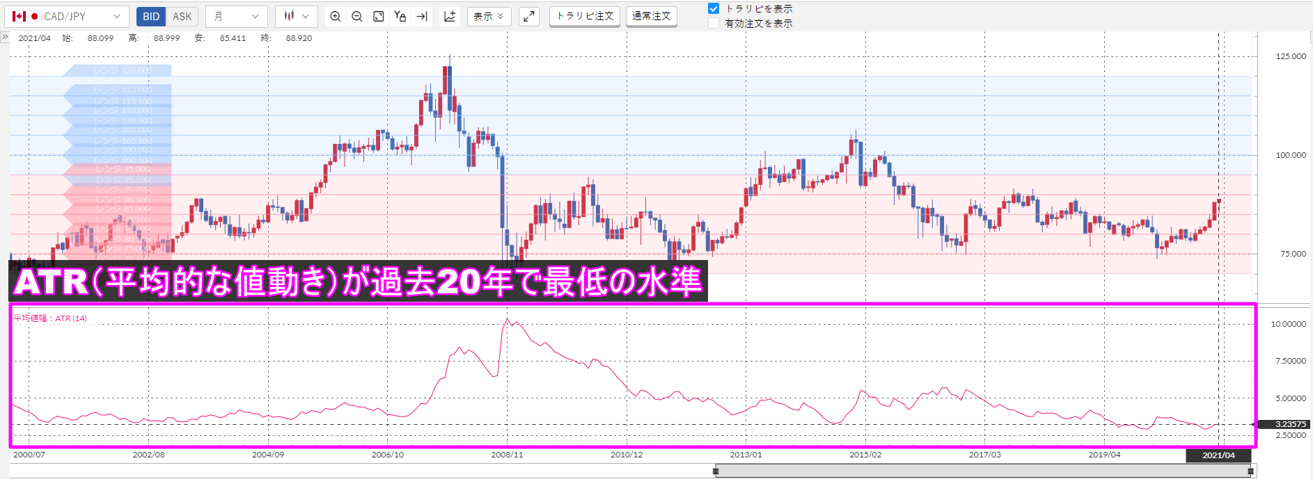 上記のチャート下部のピンクの波線が加ドル/円のATRなんですが……明らかに小さいですよね?