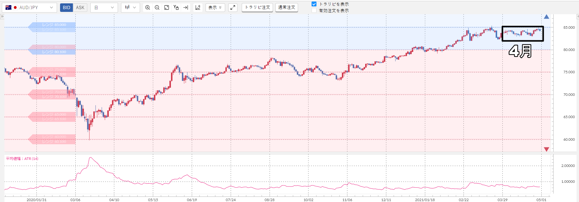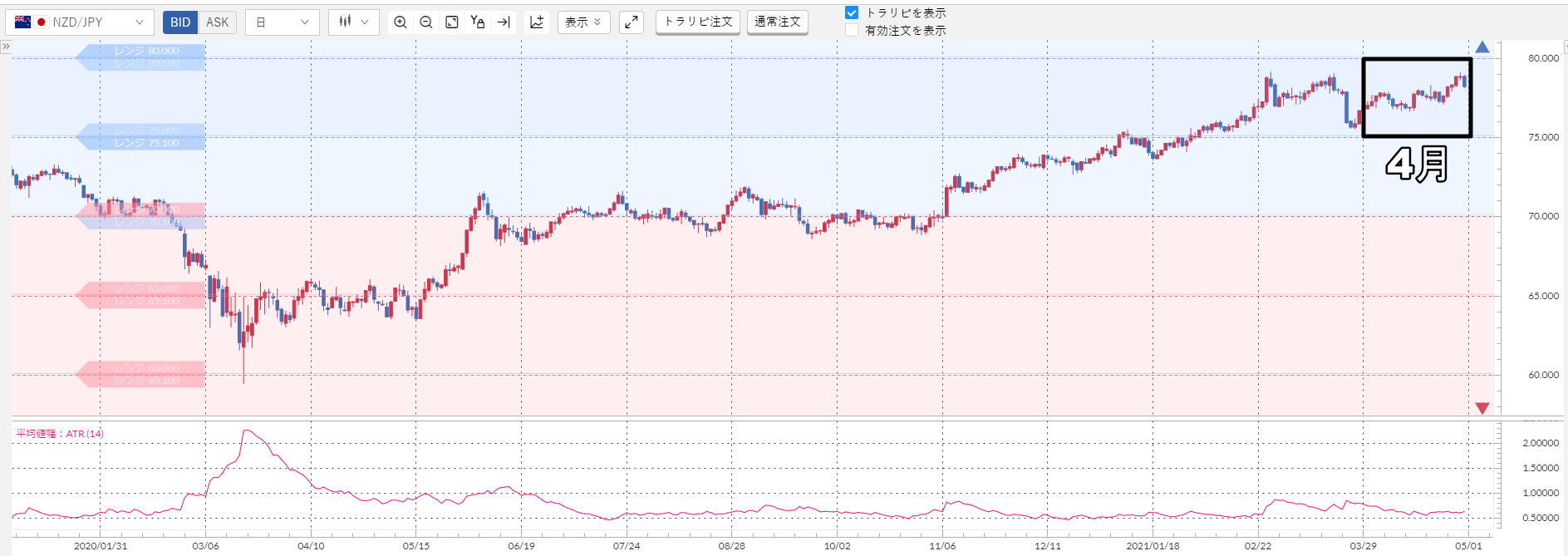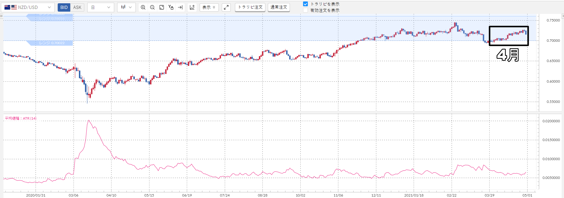 上記のチャート下部のピンクの波線が加ドル/円のATRなんですが……明らかに小さいですよね?