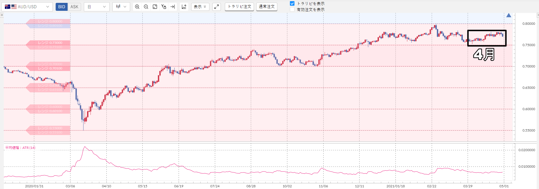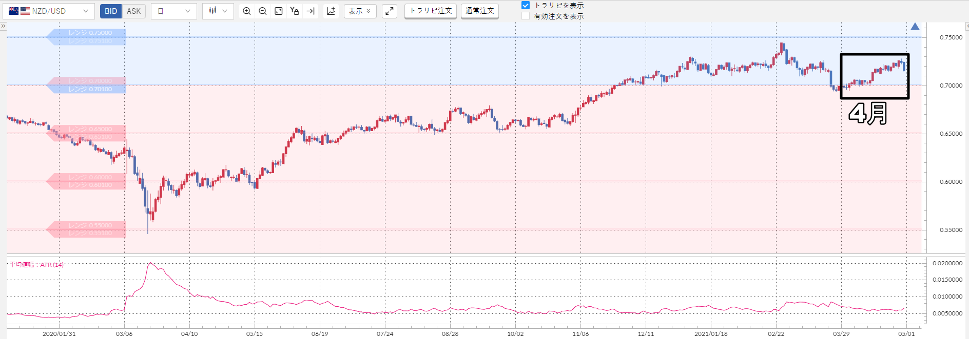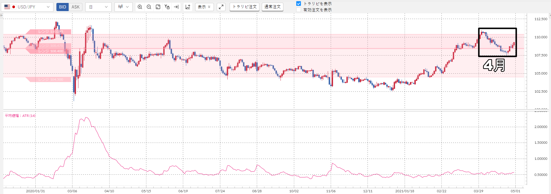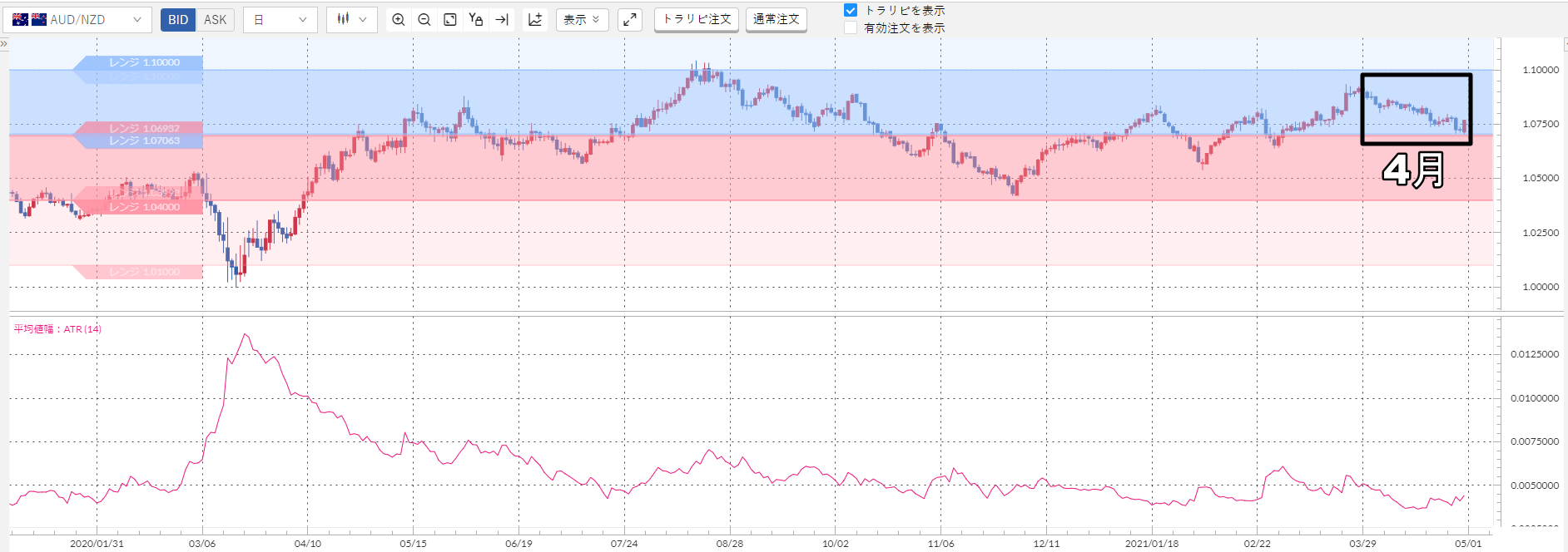 上記のチャート下部のピンクの波線が加ドル/円のATRなんですが……明らかに小さいですよね?