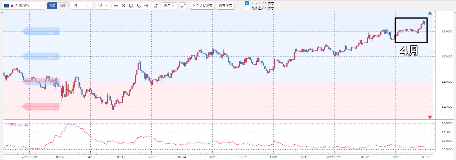 ※チャート上に仕掛けているトラリピ(赤:買いトラリピ、青:売りトラリピ)が表示されています