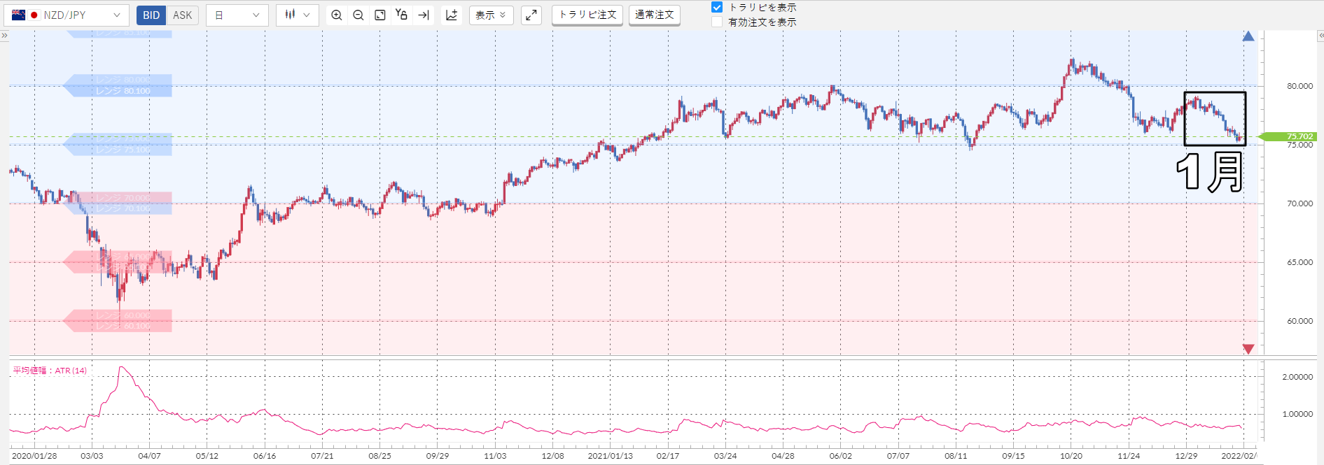 ※チャート上に仕掛けているトラリピ(赤:買いトラリピ、青:売りトラリピ)が表示されています