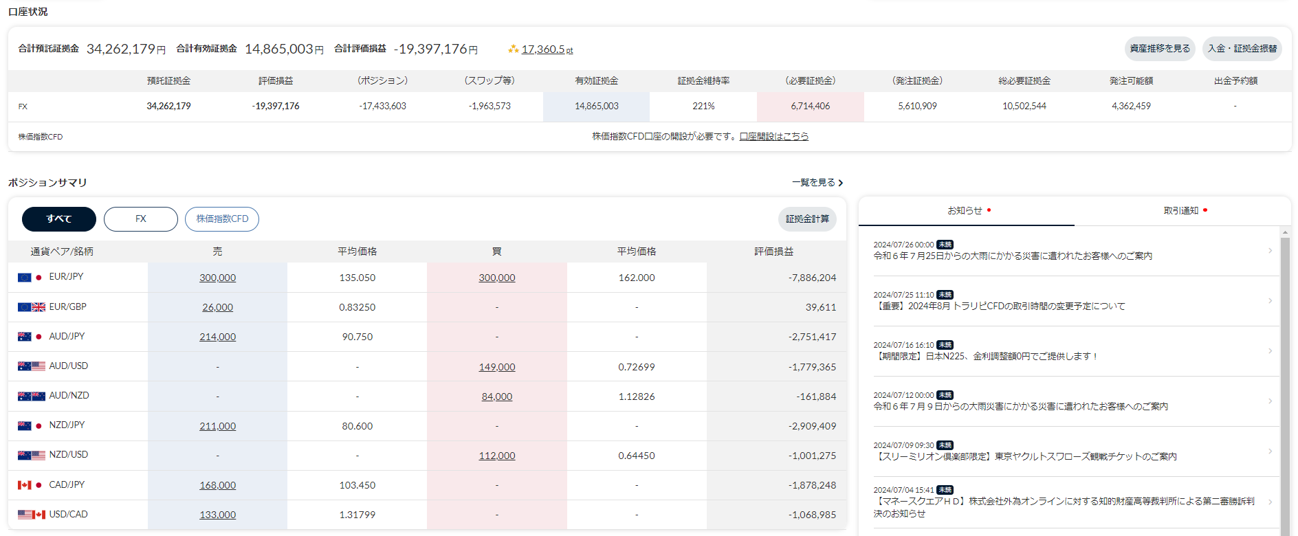 また、両建てする際に発注可能額不足していたのですが、発注中のトラリピを取り消すのが面倒になったので、ルール破りですが追加で15万円ほど入金してしまいました。