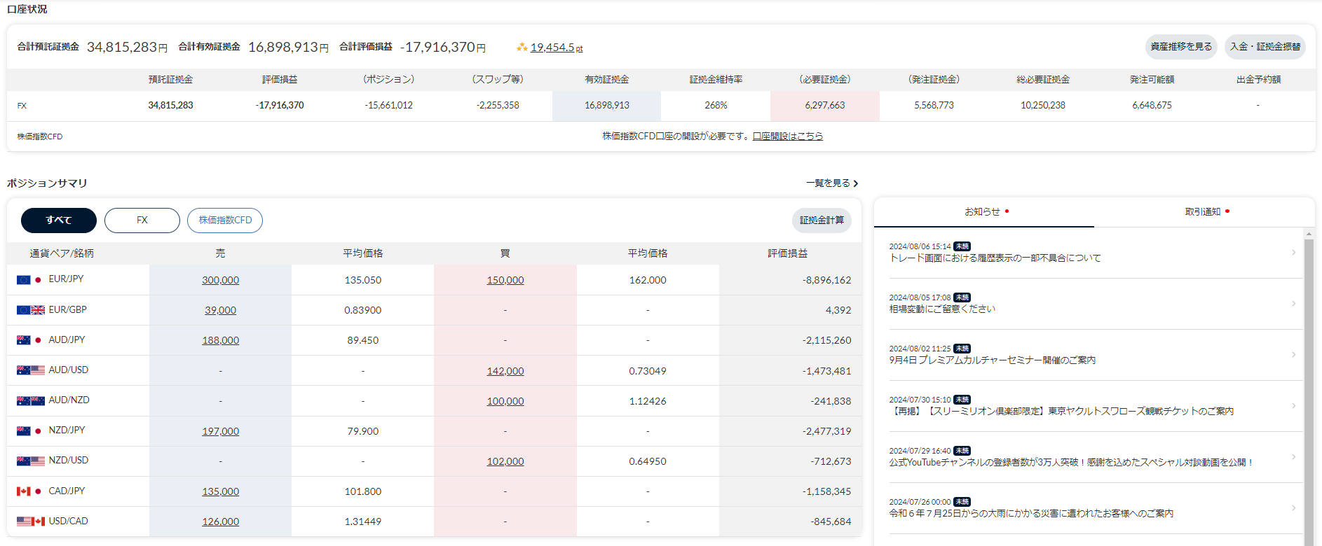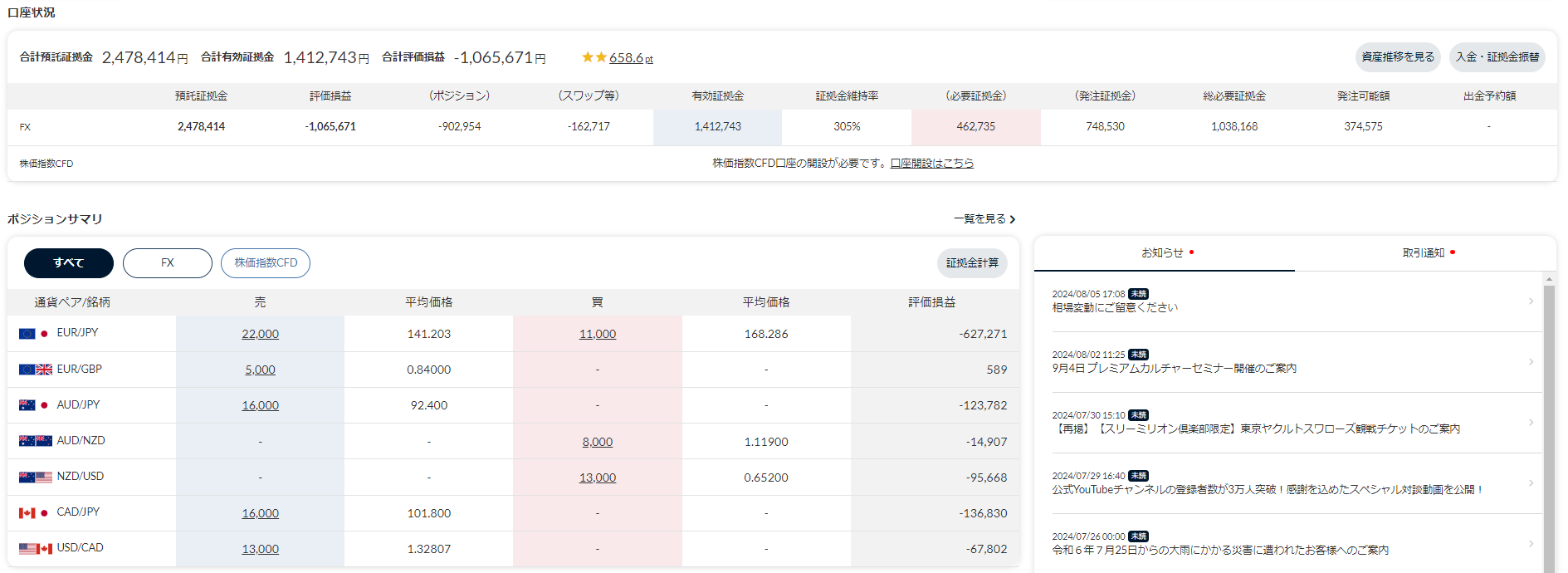 説明用なので2023年時のスクショですが、口座状況の(スワップ)に表示されている『-3,351,020円』が1年間かけて蓄積されたスワップです。