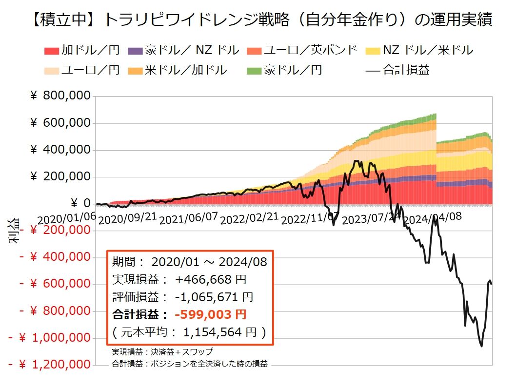 8月12日週のトラリピワイドレンジ戦略の利益は879,861円(完成形:-921,847円/積立中:-41,986円)でした(#^.^#)